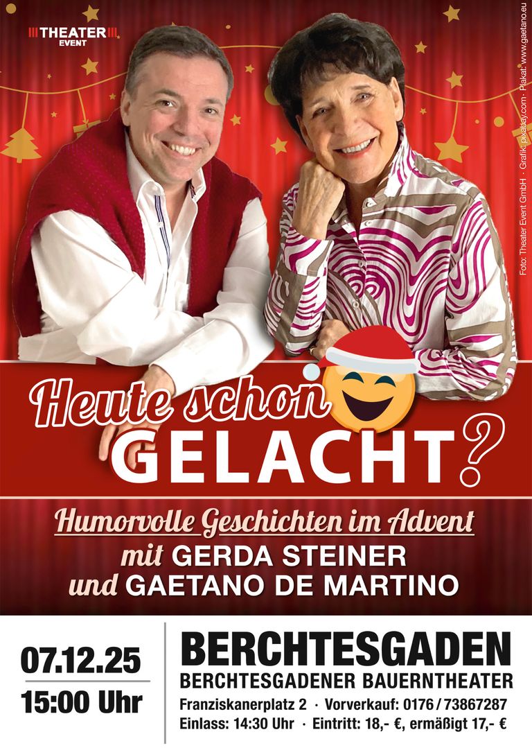 Mal humorvoll, mal besinnlich – so unterhalten die bayerische Volksschauspielerin Gerda Steiner und Gaetano De Martino mit ihrem neuen Bühnenprogramm „Heute schon gelacht?“ am Sonntag, 07.12., das Publikum im Berchtesgadener Bauerntheater.